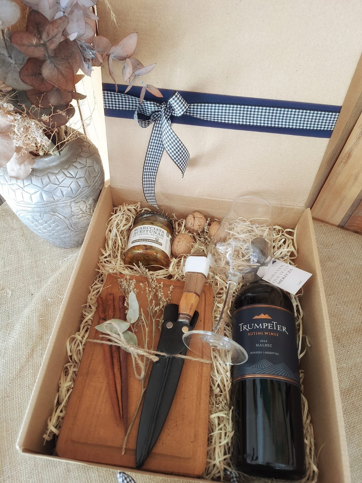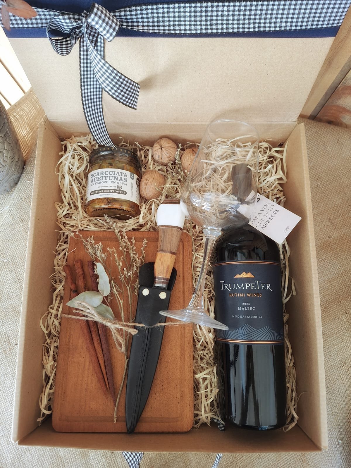 Incluye: vino malbec Trumpeter 750 ml, copa de vino, aceitunas Scarcchiata, tabla de madera, cuchillo campero con funda de cuero, pinchos de madera y decoración navideña. Todo presentado en un packaging sustentable y eco amigable, pensado para disfrutar y reutilizar.