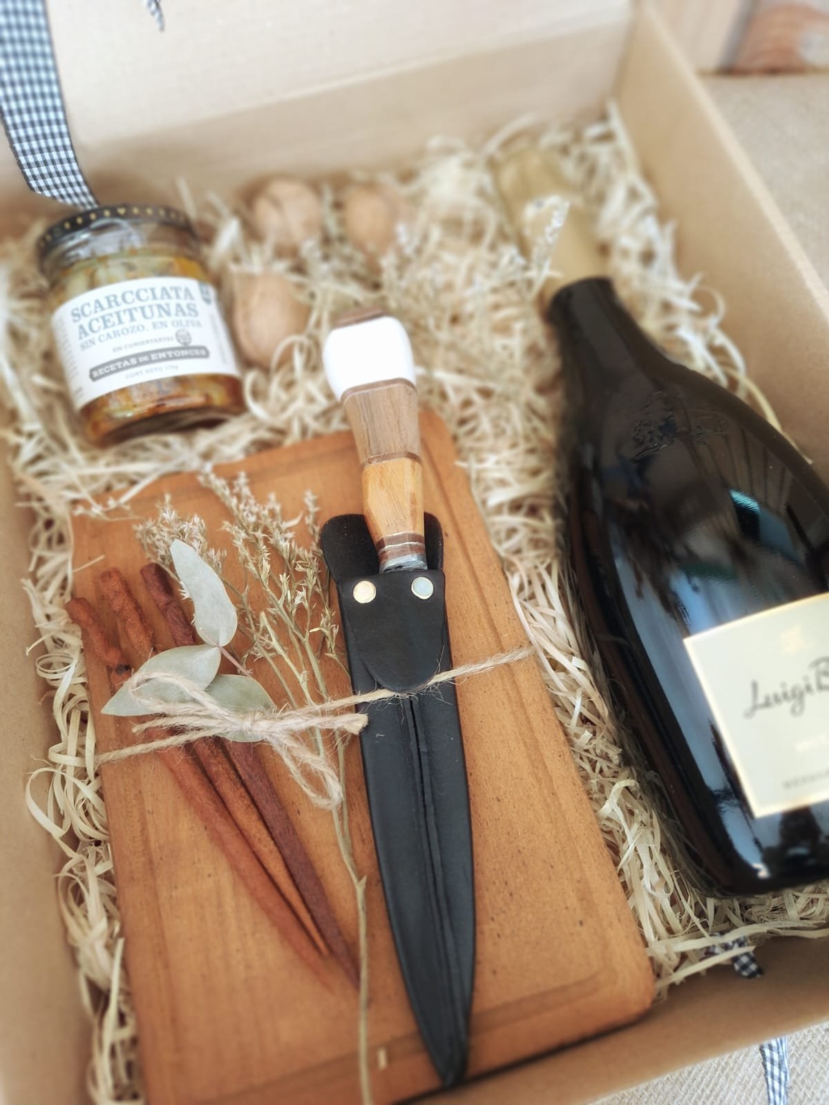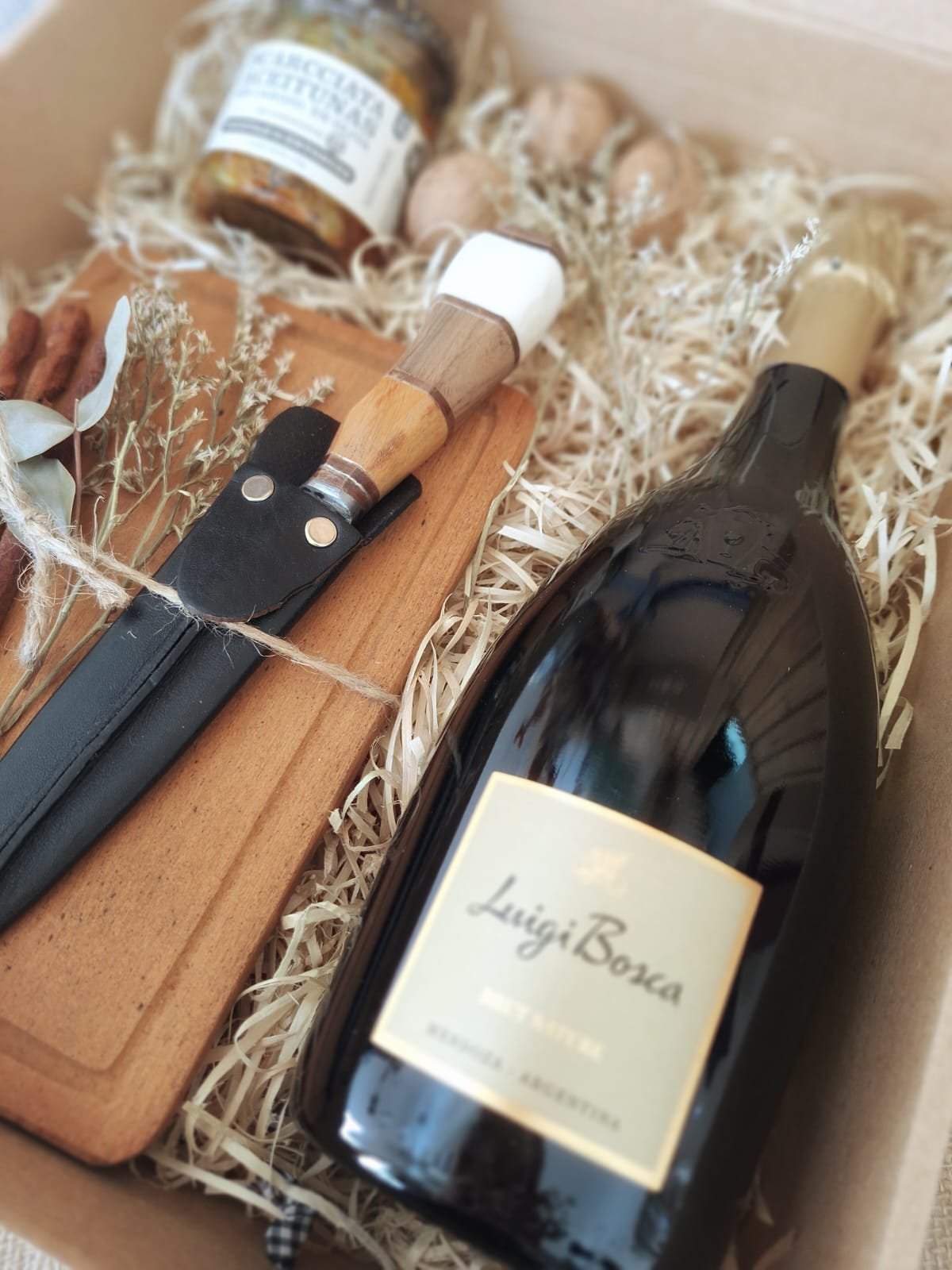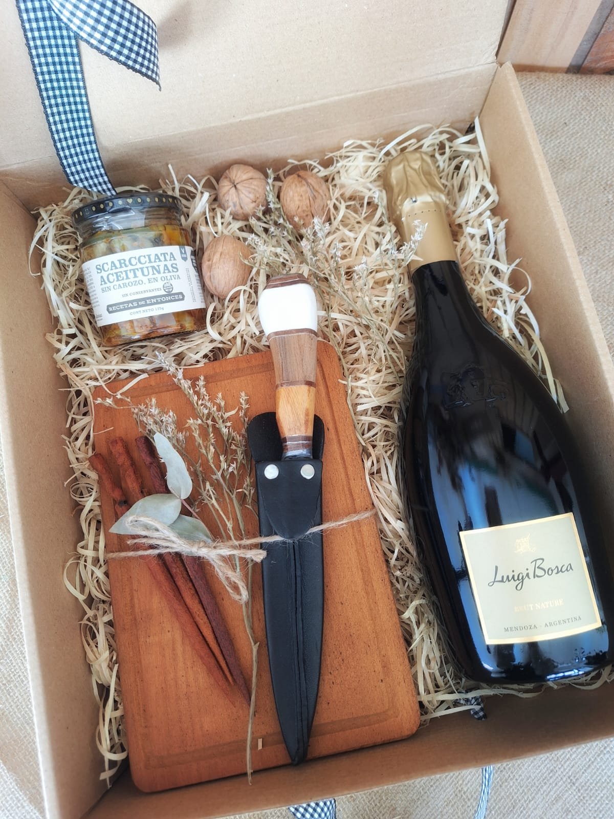 Celebra los momentos especiales con esta caja que combina sabor y estilo. Incluye: champagne Luigi Bosca Extra Brut, aceitunas Scarcchiata, tabla de madera, cuchillo campero con funda de cuero, pinchos de madera y decoración navideña. Todo presentado en un packaging sustentable y eco amigable, pensado para disfrutar y reutilizar.