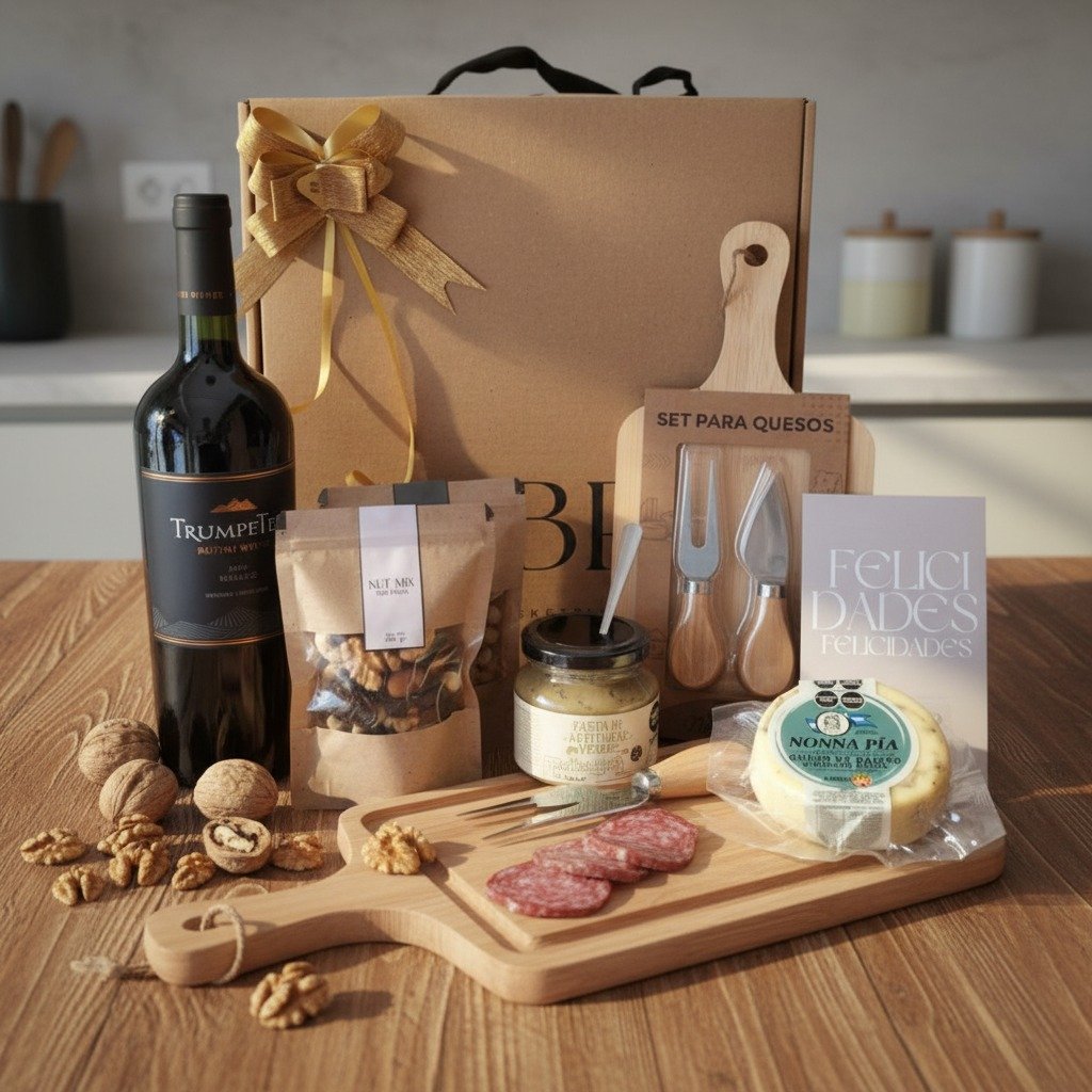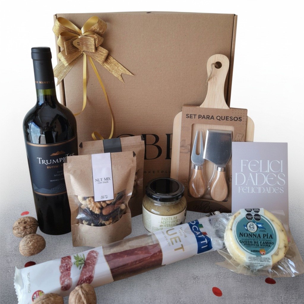 Contiene: Vino Trumpeter malbec, 100 gr mix de frutos secos premium, 100 gr pistachos salados con cáscara, hormita de queso provolone saborizado, fuet tandilense y TABLA DE MADERA CON PINCHOS PARA PICADA