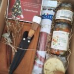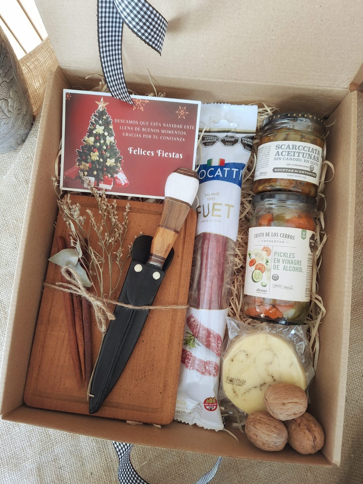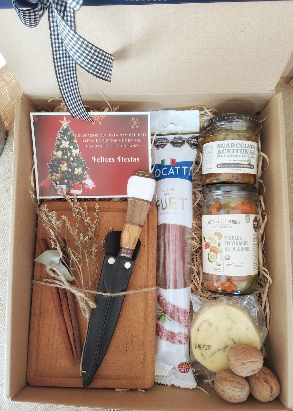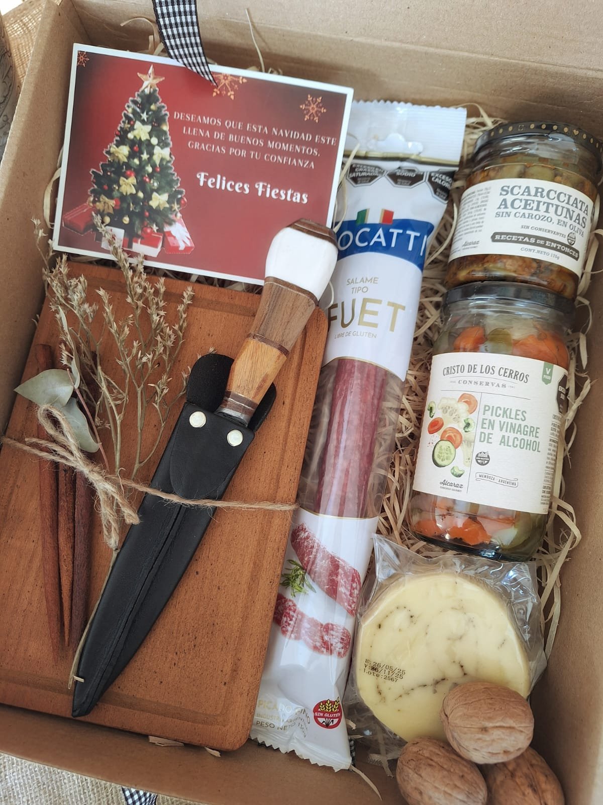Incluye: aceitunas Scarcchiata, pickles, queso provolone saborizado, fuet picado fino, tabla de madera, cuchillo campero con funda de cuero, pinchos de madera y decoración navideña. Todo presentado en un packaging sustentable y eco amigable, pensado para disfrutar y reutilizar.